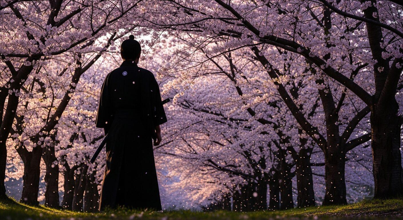 桜並木の中に立つサムライの後ろ姿を、「桜のいさぎよさ」「時代や歴史の広がり」を示すカットとして、本文中の章頭に配置。 - セクションフッター画像: