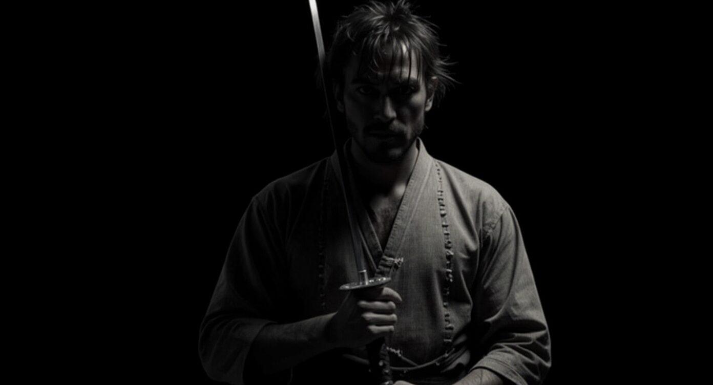 闇の中で刀を構える人物像を、「行動する直前の緊張」や「覚悟の境界線」を象徴する締めの一枚として活用し、セクションの余韻をつくる。