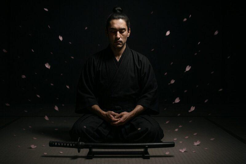 正座して瞑想するサムライの正面に、日本刀が鞘に入った状態で置かれている。